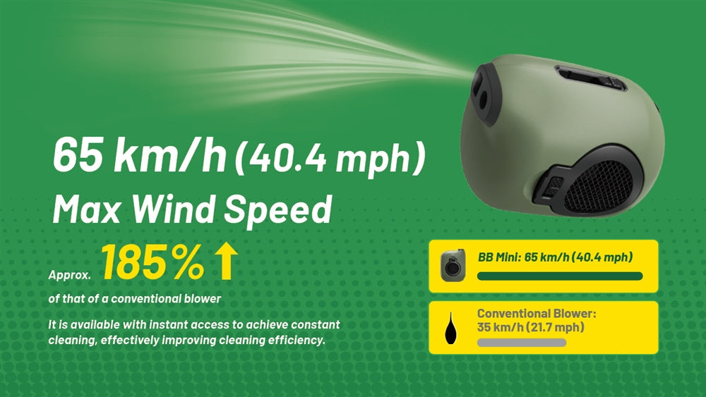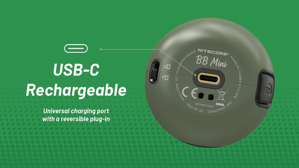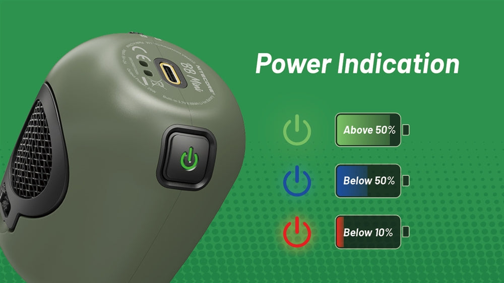 Once charged, the BB Mini can power the fan for over 30 minutes of continuous use. The tri-color battery level indicator lets you know when to recharge; plug in the USB-C cable for fast charging to full in 1.5 hours.