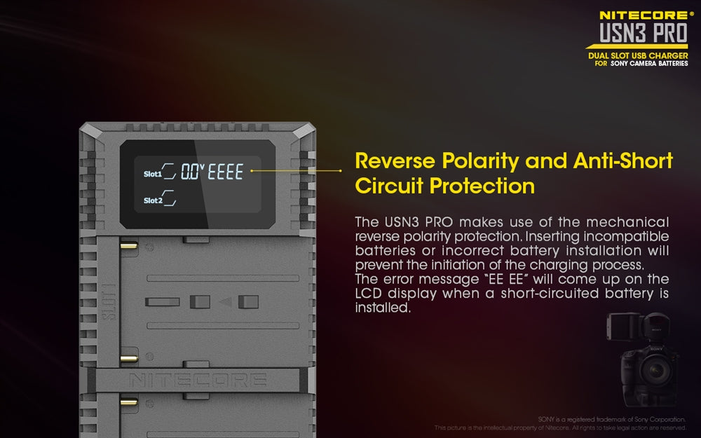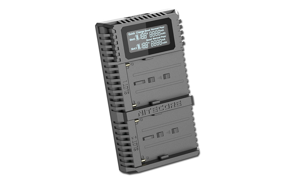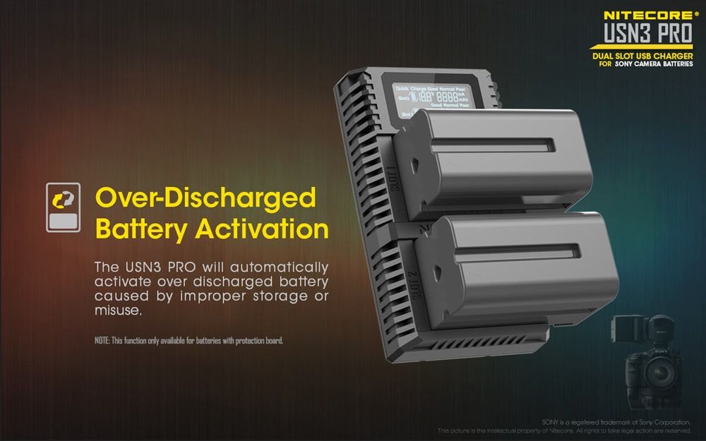 Introducing the NITECORE USN3 Pro intelligent USB dual-slot superb battery charger designed for Sony camera batteries to recharge your batteries fast, safe and efficiently. The USN3 Pro can charge two batteries simultaneously with a maximum output of 800mA in either slot when using a 2A output USB power adapter. When the charger is connected to a quick charge (QC) power adapter, the screen will show Quick Charge and a single slot will achieve a max output of 1200mA. The USN3 Pro supports various battery types (Sony NP-FM500H, NP-F730,NP-F750, NP-F550, NP-F970, NP-F770) and camera models (a99 II, a77 II, a99, a68).