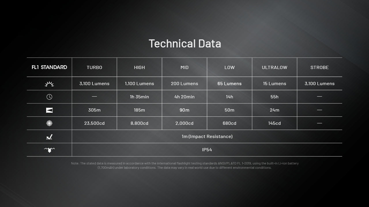 The EDC27 UHi has a built-in 1700mAh battery that can be charged through its built-in USB-C port. Once fully charged, the EDC27 UHi can achieve a maximum runtime of 55 hours on its lowest mode. Additionally, the EDC27 UHi can withstand impacts of up to 1 meters, holds an IP54 rating, and employs patented advanced temperature regulation, ensuring reliable performance in any environment.