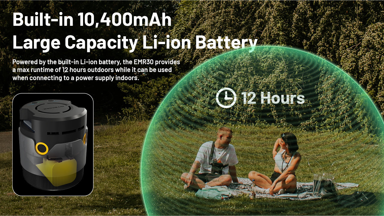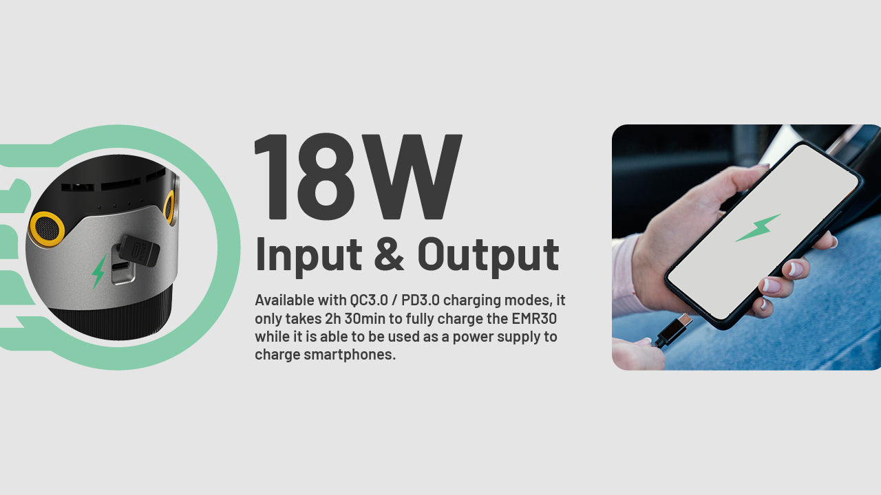 The EMR30 has an extended runtime of 12 hours. The built-in USB-C port is QC 3.0 capable and can charge the EMR30 to full in 2.5 hours. Out you say? The EMR30 can double as a functional power bank and can dispense power to your electronic devices a must have for emergencies.