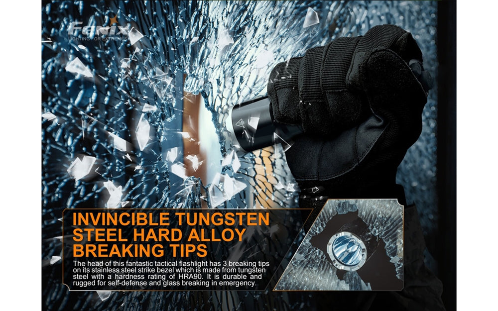 The Fenix TK16 V2 is the latest 21700 battery powered high lumen flashlight with all the bells and whistles. Capable of 3100 lumen max output, this handheld torch can reach up to 415 yards of throw. The stainless steel bezel of the TK16 V2 is inlaid with tungsten impact tips, great for emergency glass rupturing. The TK16 V2 features the familiar tail switch with momentary or constant-on and easy to reach secondary tail switch for mode selection and one-touch strobe.