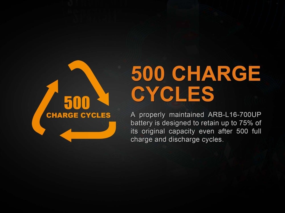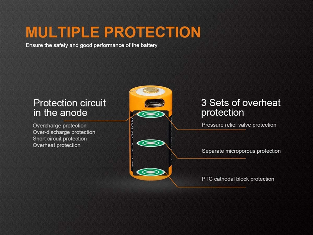 The Fenix ARB-L16-700UP battery (16340) is designed to power high drain devices such as flashlights, lanterns, headlamps, and bike lights that require a max discharging current up to 2.5A or 3.5C. This battery can be directly charged using a standard micro-USB charging cable (sold separately) using a built-in USB port located directly on the battery. This battery also has a button-top and works in the majority of button-top compatible devices. Rest easy as the ARB-L16-700UP includes specialized anode technology to help prevent short circuits when charging, discharging, and over heating.