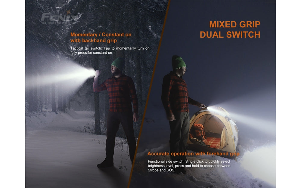 Designed to fit the needs of any user, the dual switch set up allows for tailcap backhand grip, or forehand grip. So you can control the five brightness modes, and strobe/SOS for hiking, camping, jogging, to industrial and professional use.