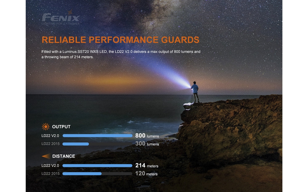 The Fenix LD22 v2.0 is the most rugged pocket penlight with big power and big dreams. This slim EDC flashlight can produce an 800 lumen max cool light for daily use. What is most surprising is this compact light can reach up to 234 yards of beam throw with its upgraded Luminus SST20 WXS LED. The LD22 v2.0 is rated IP68 waterproof, impact resistant, and has a sleek steel bezel. This pocket light is a must have EDC and comes with a rugged pocket clip, holster, and lanyard.