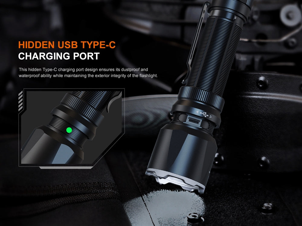 The TK22R flashlight offers the convenience of USB-C rechargeability. Simply twist the knurled grip portion to access the built-in fast charging port. A power indicator is included to notify you when it's done charging, while the lockout mode ensures accidental activation is prevented. With a full charge, this flashlight can provide up to 50 hours of continuous use in low mode and can be fully charged in just 3.5 hours.