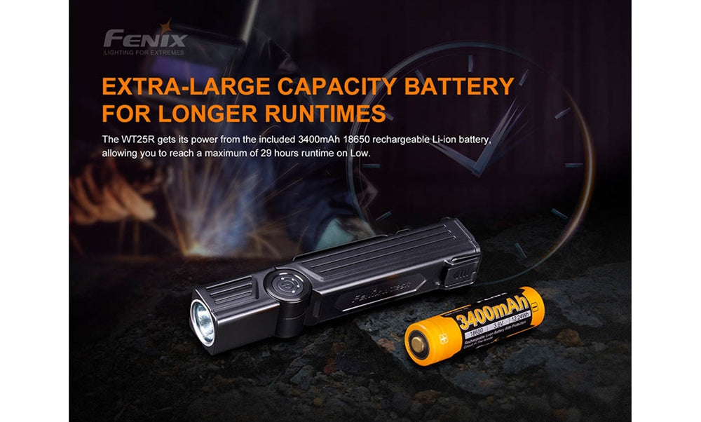Included with the WT25R is a 3400mAh high capacity 18650 rechargeable Li-ion battery that can provide up to 29 hours of runtime. With just a single tap, the quad-LED indicator on the side switch provides accurate remaining battery levels so you know when it's time to charge. When it is time to recharge, just plug the included USB cable into a USB power source and snap the magnetic end to the charging port of the WT25R.