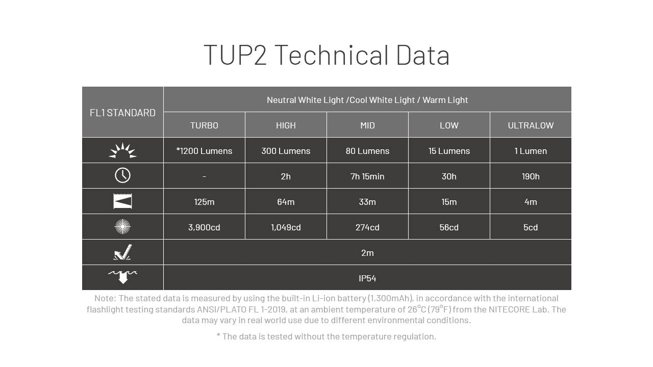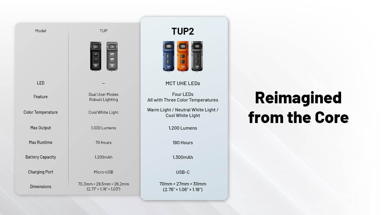 The Nitecore TUP2 is a lightweight, multi-color temperature keychain flashlight that delivers up to 1200 lumens with a beam distance of 136 yards - perfect for everyday carry, camping, and hiking. Compared to its predecessor, the TUP2 is brighter, runs longer, and offers more lighting options. Its new Multiple Color Temperature (MCT) LEDs let you switch between warm, neutral, and cool light, optimizing visibility and comfort in any weather, terrain, or lighting condition. Warm Light (3000K) is gentle on the eyes and cuts through fog and rain, Neutral White (4500K) provides balanced illumination for daily tasks, and Cool White (6500K) enhances visibility in outdoor environments. With up to five brightness levels available for each color temperature, the TUP2 offers remarkable versatility.