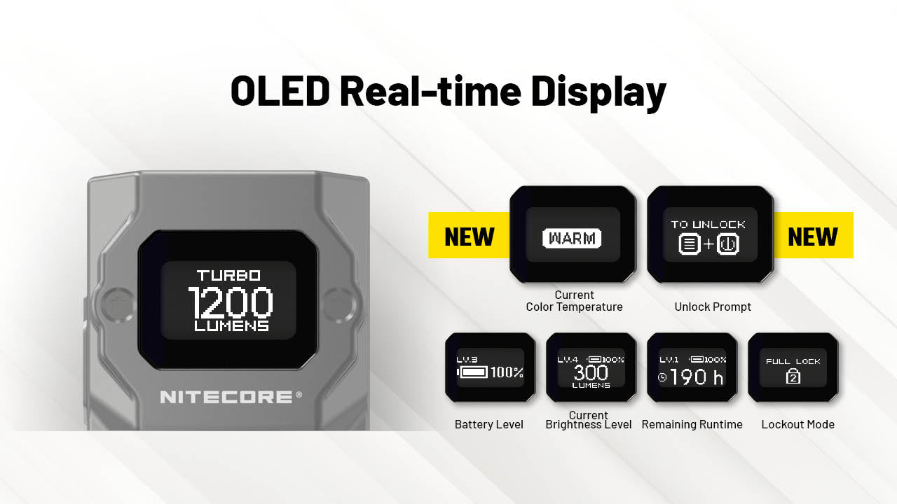 The TUP2 also features an OLED display that provides real-time information, including brightness levels, color temperature mode, remaining runtime, battery status, and more, keeping you fully informed. Its USB-C charging port ensures quick and convenient recharging, reaching full power in less than 1.5 hours. Additionally, it features two lockout modes: Semi Lockout, which allows access to Turbo mode, and Full Lockout to prevent accidental activation.