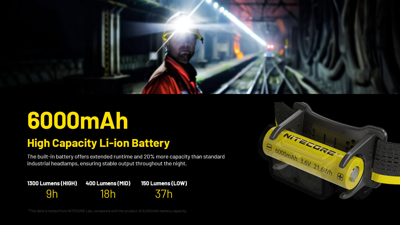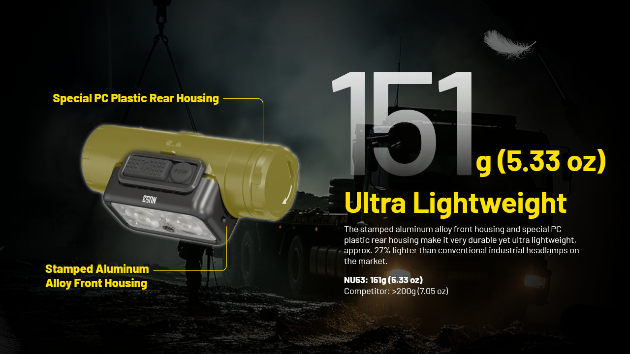 Weighing only 5.33 oz, the NU53 is a lightweight headlamp perfect for wearing at work, night running, outdoor adventures, or camping. With a 6000mAh rechargeable battery, it can achieve a maximum runtime of 153 hours on its lowest setting. It also has USB-C fast charging, taking less than 3 hours to reach full power. A power indicator lets you know when it's time to recharge, and the lockout mode prevents accidental activation. The NU53 is also rated IP68 water-resistant and can withstand impacts of up to 2 meters, making it a reliable companion for job sites, everyday tasks, camping, hiking, and more, in any environment.