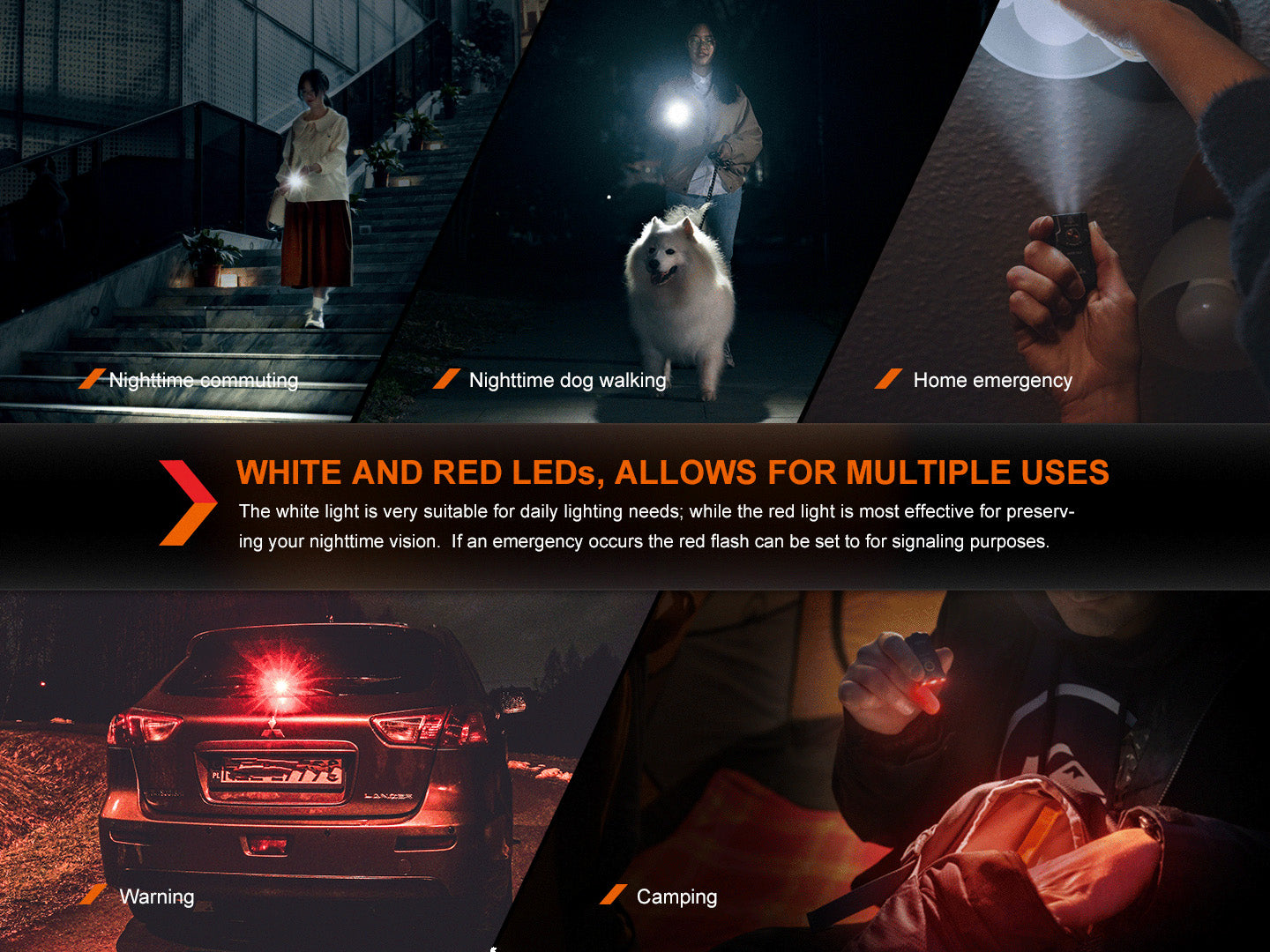 The kit also includes the Fenix E03R V2.0 keychain light, emitting a maximum of 500 lumens of white light for daily usage and a 5-lumen auxiliary red light for night vision. With four adjustable brightness levels and two red modes, this flashlight offers increased versatility for different situations. Additionally, the breathing light ring around the power button can flash red and green for long-lasting signal indication.
