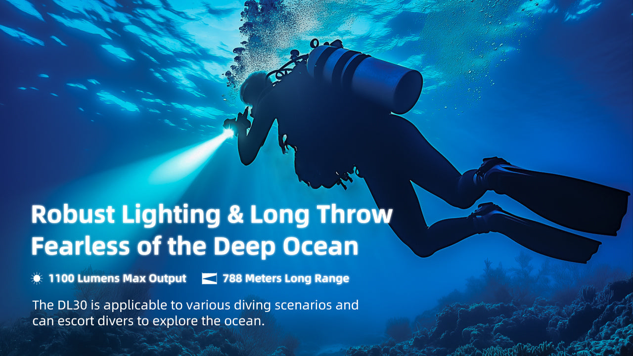 The DL30 can be charged via its USB-C rechargeable battery that can provide a runtime of up to 6 hours. A circular power indicator is located around the DL30’s power button that will change colors depending on its remaining battery life. Built for rugged underwater use, the DL30 features thickened tempered glass and a hard-anodized finish, giving it an IP68 waterproof rating and impact resistance of up to 1 meter. The included wrist lanyard ensures secure handling during dives, making it an indispensable companion for any diver.