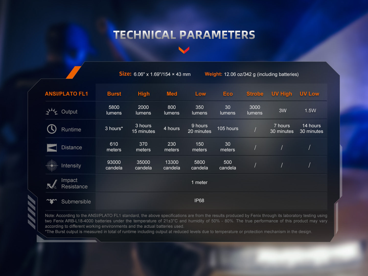 The Fenix TK35R is a powerful long-range flashlight that delivers up to 5,800 lumens and reaches an impressive distance of 667 yards, making it an essential tool for patrolling, outdoor exploration, and search-and-rescue missions. It offers five brightness levels and a strobe mode to meet a wide range of lighting needs. Additionally, the TK35R features two UV light settings that help identify items such as counterfeit money, stains, or leaks, whether you're working up close or at a distance.