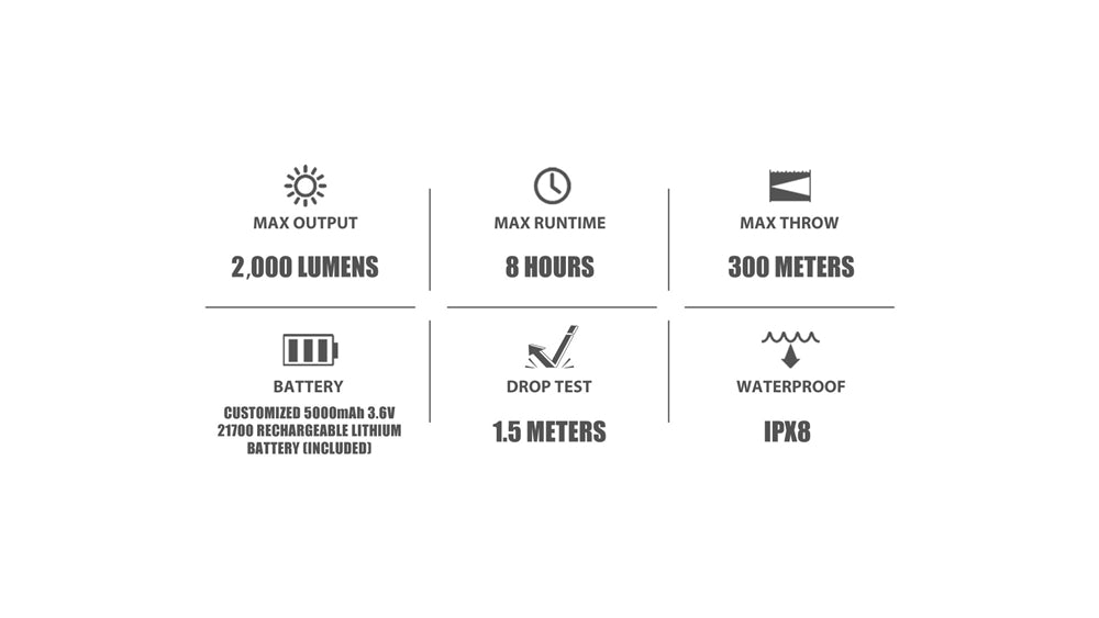 Mode 1 | 2000 ⥊ 1000 ⥊ 760 ⥊ 300 lumen | 2min ⥊ 9min ⥊ 125min ⥊ 24min |