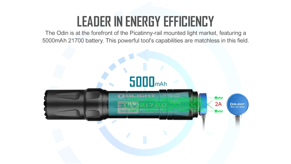 Running out of battery in the middle of a night operation is the last thing you ever want. Fortunately, the Odin comes with a 5000mAh 21700 battery which yields up to 8 hours of total runtime. Moreover, you can fast charge ( >2A ) the light by snapping the included magnetic USB cable to the rear of the light. There are no tailcaps to remove, or batteries to swap!