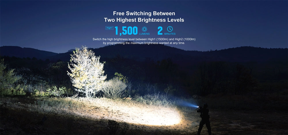 High1 | 1500 lumens⥊600 lumens⥊300 lumens | 2 + 36 + 8.5 minutes |
