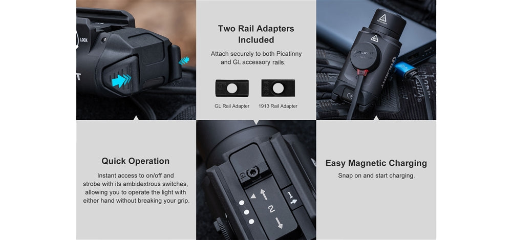 Equipped with a built-in battery that can be fast charged via the magnetic USB cable that snaps to the underside of the light, you can recharge the PL-3R without detaching it. The classic tail button design from Olight caters to both left and right-handed operation, making it easy to switch between its four output modes. The light also features a programmable high mode, giving you the option to choose between 1500 lumens or a more battery-efficient 1000 lumens, and a quick double tap for a powerful strobe for disorientation.