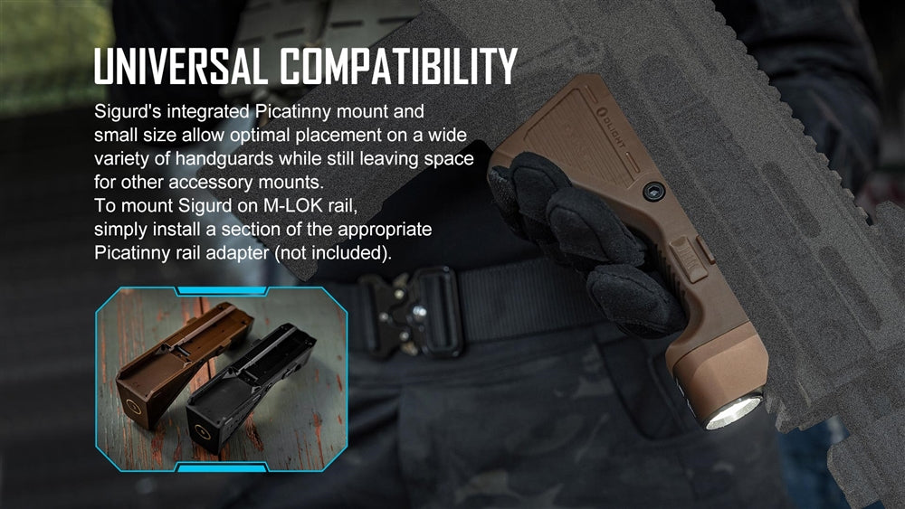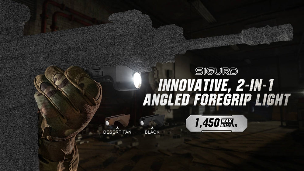 The Olight Sigurd angled foregrip comes with a built-in 1450 lumen rechargeable flashlight and mounts on picatinny rail. Its high performance LED is protected with a stainless steel bezel for the toughest applications. The sleek unibody design with clean simple lines with anti-slip texturing goes well with any foreguard while providing a comfortable and secure grip and heat insulation from the barrel. The two-in-one Olight Sigurd adds security and lighting and prevents whiplash in your back and neck.