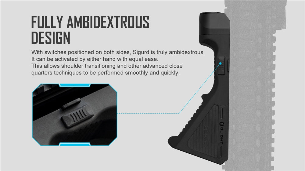 In addition to fantastic ergonomics, the Sigurd is completely ambidextrous with protected switches on both sides for operation. This way you maintain a secure grip during mode changes or target acquisition. The Sigurd comes with two brightness levels to cover all of your tactical lighting scenarios.