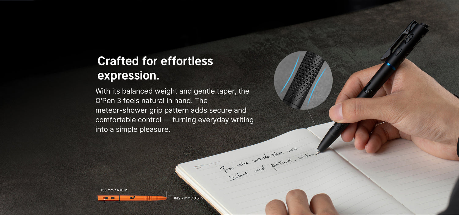 Made from aluminum with a gently tapered profile and a meteor-shower-inspired grip, the O’Pen 3 feels natural in your hand and remains comfortable during extended use. Measuring 6.10 inches and weighing just 1.18 oz, it carries as a pen should. A hidden USB-C charging port fully recharges the battery in about one hour while preserving a clean, seamless design. Whether you’re taking notes, working in low light, or leading a presentation, the O’Pen 3 delivers confidence, precision, and versatility in every task.