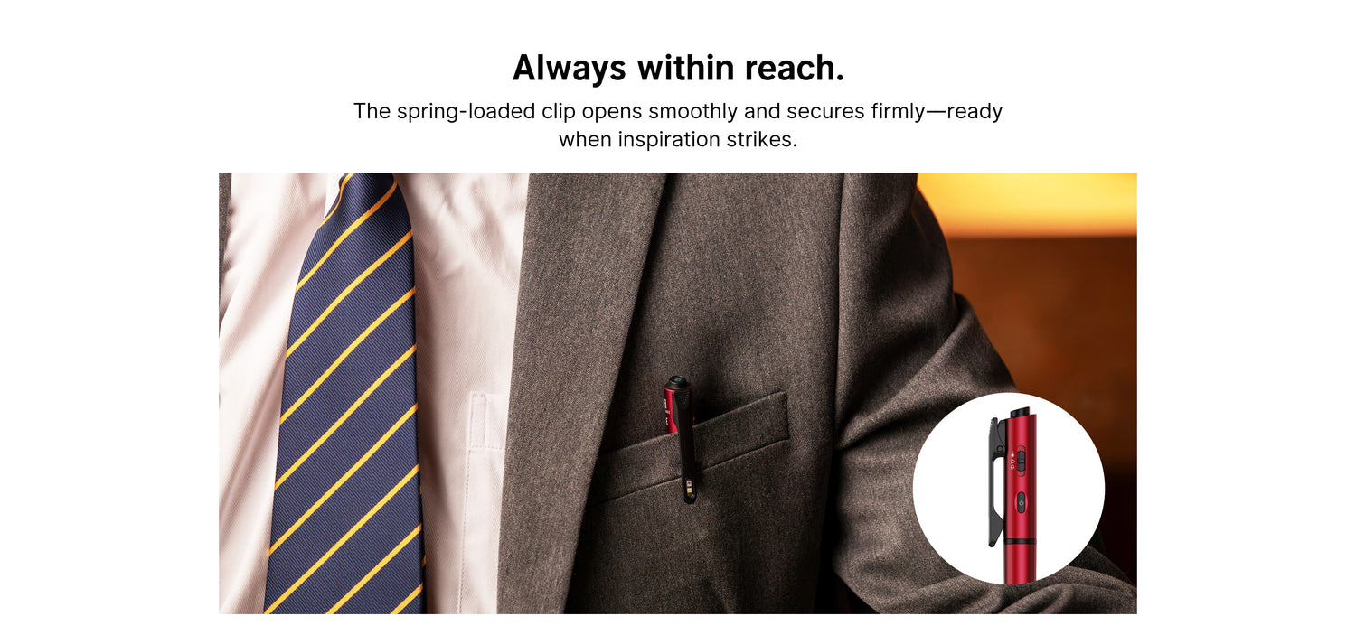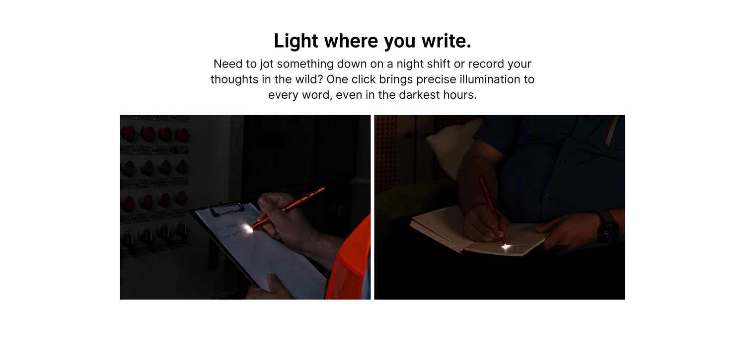 The O’Pen 3 is a precision writing instrument enhanced with multiple illumination and presentation tools, designed for professionals who write, inspect, and present in their day-to-day life. Instead of treating light as an add-on, it integrates illumination exactly where it’s needed - without compromising balance, comfort, or writing performance. The pen tip light softly illuminates the page at the point of contact, allowing smooth, glare-free writing in dim rooms, aircraft cabins, or nighttime job sites.