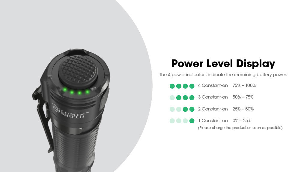 The EDC31 can be charged through its built-in USB-C port. Once fully charged, the EDC31 can achieve a maximum runtime of 57 hours on its lowest mode and can be fully charged in under 2 hours. A power indicator located on the top of the tailcap will notify you of the battery level and when it's done charging. The EDC31 also features two lockout modes with an easy-to-use sliding switch: Half and Full to prevent accidental activation and quick access. In Half Lockout Mode, you can still access the Search and Lumin Shield, while the Full Lockout will fully prevent any accidental activation.