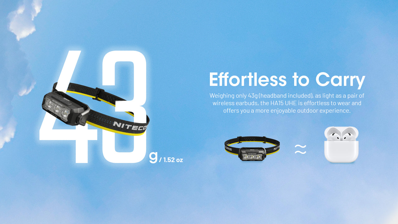 Weighing only 2.29 oz, the HA15 UHE is an ultralight headlamp perfect for backpacking when every ounce matters. Yet, it still can achieve a maximum runtime of 82 hours on its lowest setting. The HA15 UHE is also rated IP66 waterproof and can withstand impacts of up to 1 meter, making it a reliable companion in any environment for job sites, everyday tasks, camping, hiking, and more.