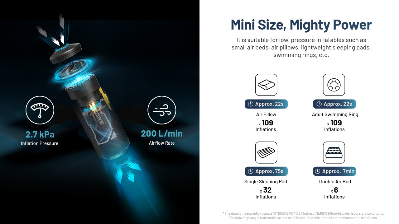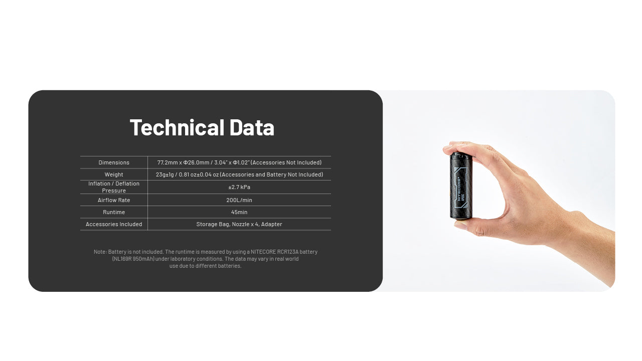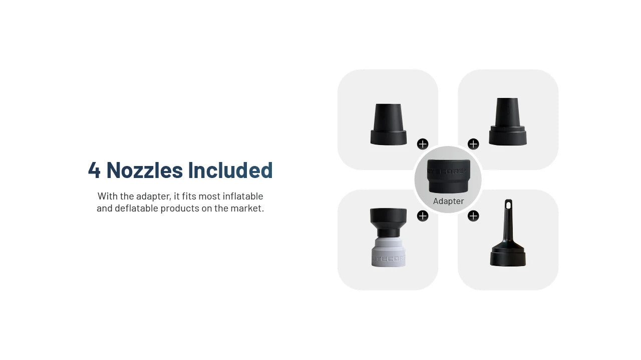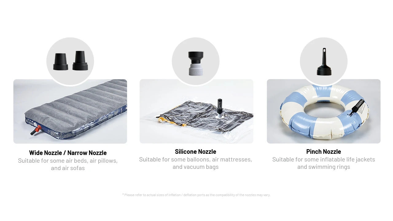 Powered by a USB-C rechargeable NL169R battery, the AP05C can run for up to 45 minutes, allowing for multiple uses before needing a recharge or battery swap. It includes four nozzles to fit a variety of valve types, making it compatible with a wide range of inflatable products. Weighing just 0.81 oz, it’s compact and portable enough to bring along on any trip.