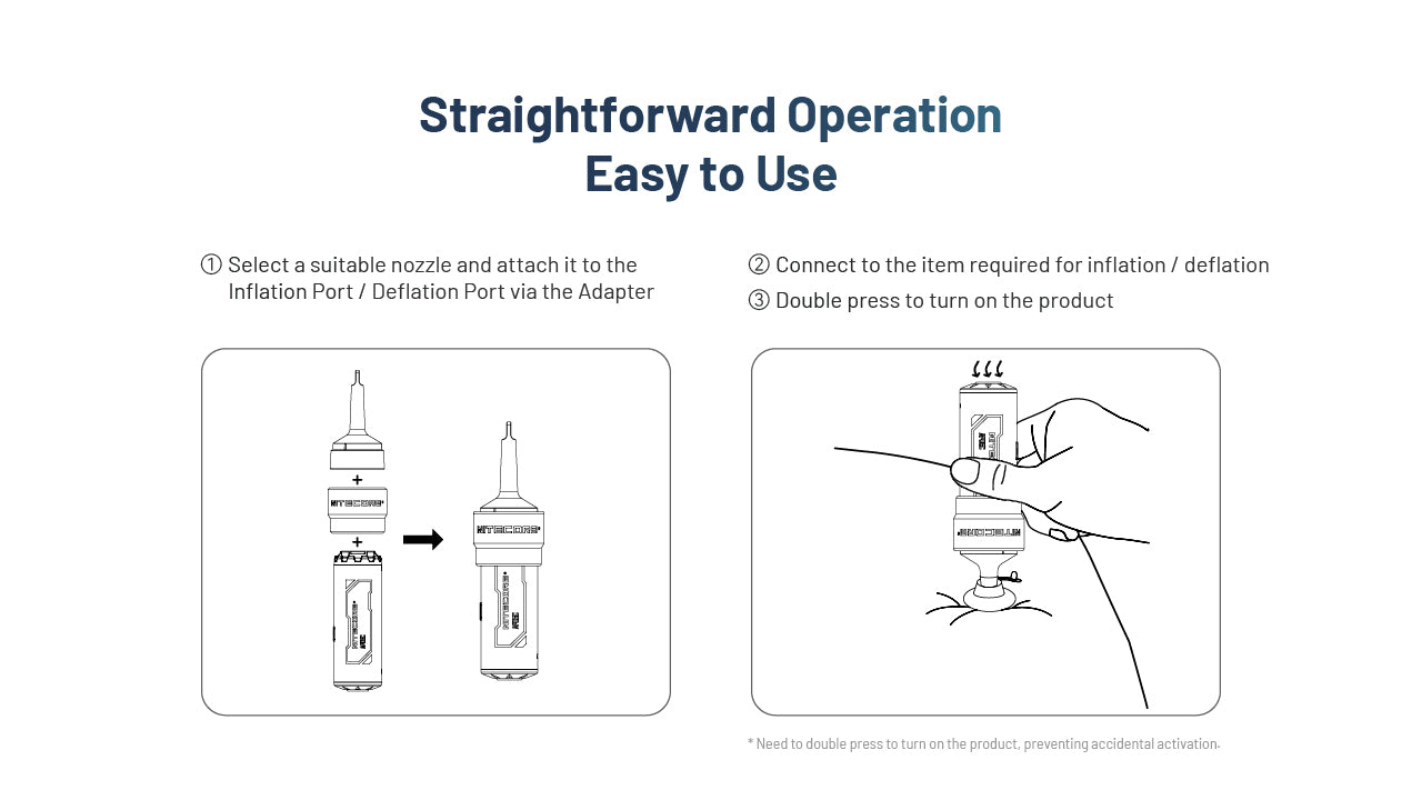 Using the AP05C is simple and intuitive. Just attach the appropriate nozzle to the adapter and connect it to either the inflation or deflation port. To distinguish between the two, the inflation port is on the right side of the AP05C when facing the logo, while the deflation port is on the left. The pump’s one-button interface allows for easy operation, so you can focus on your task without fumbling with complicated controls.
