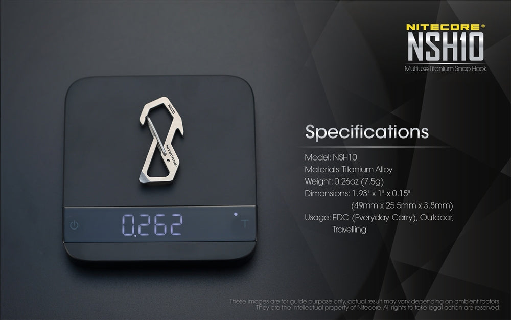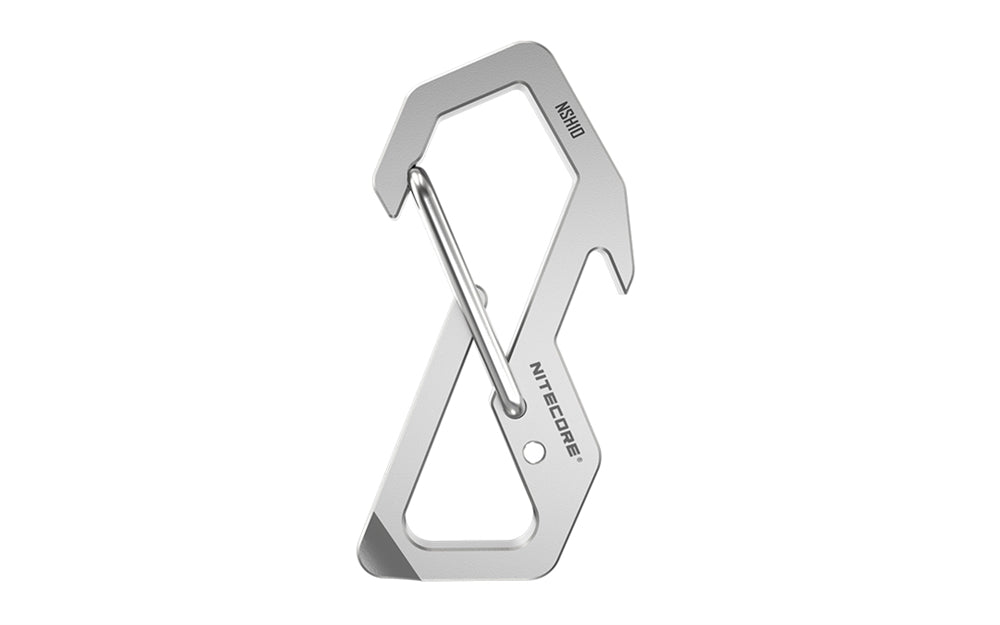 The NITECORE NSH10 titanium snap hook is a lightweight and stylish must-have edc multi-tool carabiner. The precision machining yields a slick design with stylish angular lines and a smooth fine sandblasted finish. The textured finish allows for a nice grip texture, with an easily manipulated 45 degree spring-loaded latch.