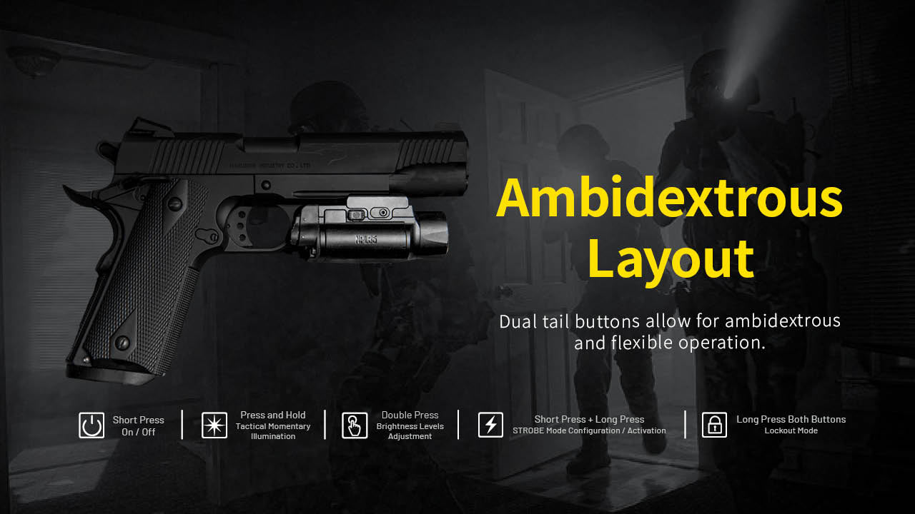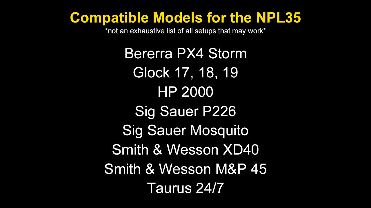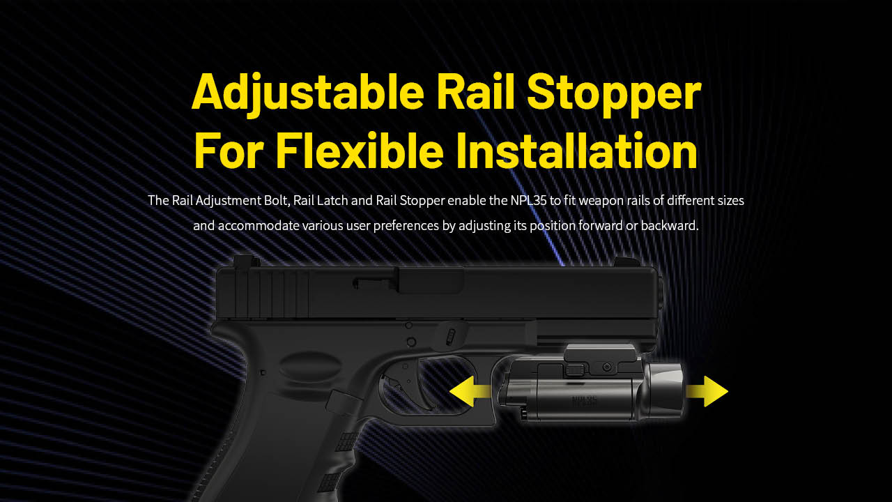 The Nitecore NPL35 is a rail mount tactical flashlight that fits most compact and full-size pistols, delivering a maximum output of 2000 lumens and a throw of 450 yards. With a peak beam intensity of 42,500 candelas, the NPL35 provides an intense spotlight and ample floodlight simultaneously, offering clear visibility of both distant and nearby surroundings. Installing the NPL35 is effortless; simply align the rail stopper with the recoil groove of the rail and slide the NPL35 forward or backward to your desired position. A rail adapter is included for added versatility. The NPL35 features an ambidextrous switch design catering to both left and right-handed users, allowing for flexible operation. It offers two lightning modes: High and Low, while also allowing the option for momentary illumination as well. It also includes a Strobe mode to help keep you safe in any situation.