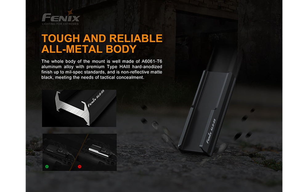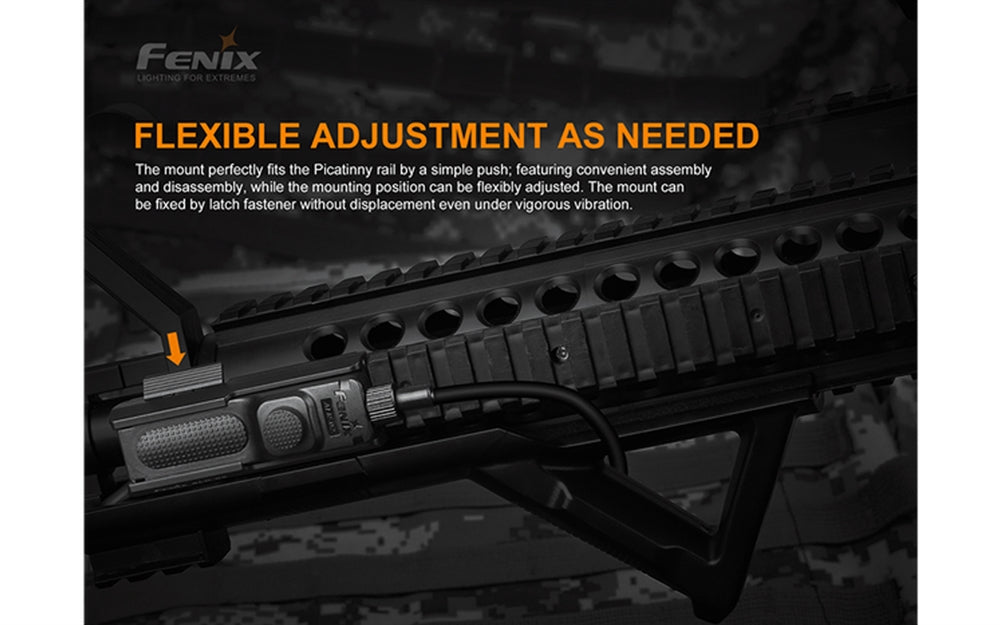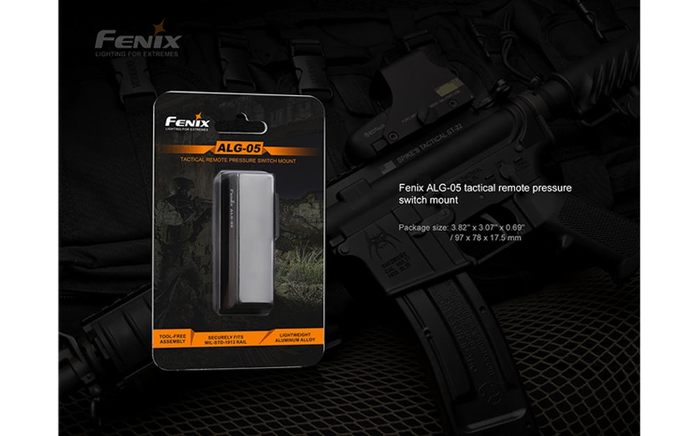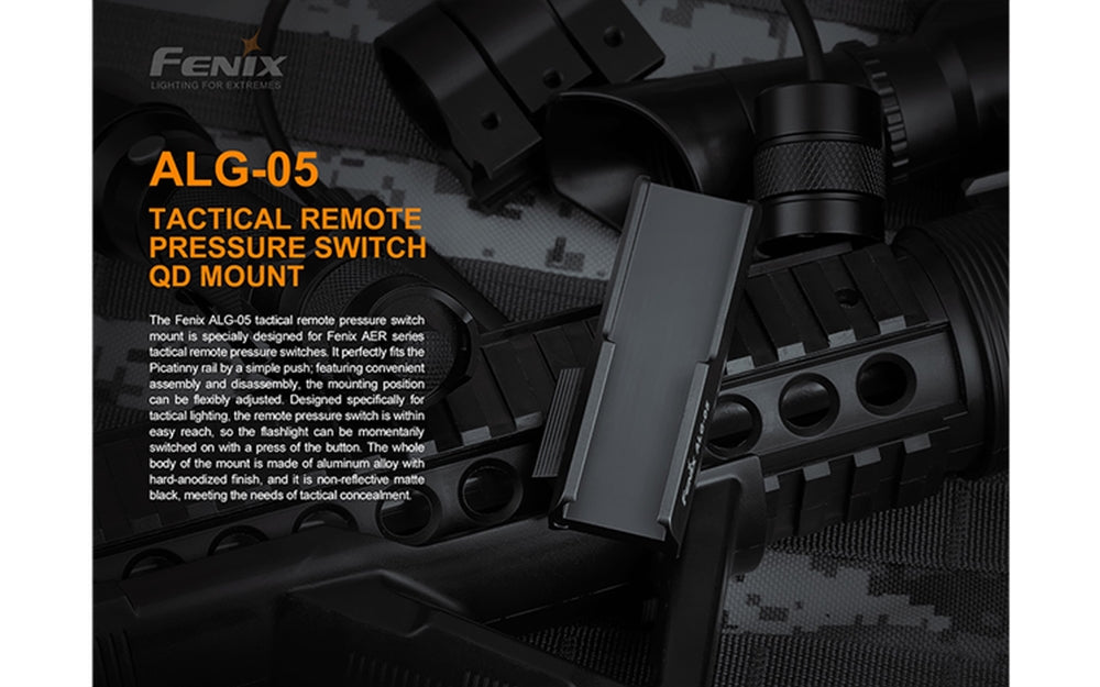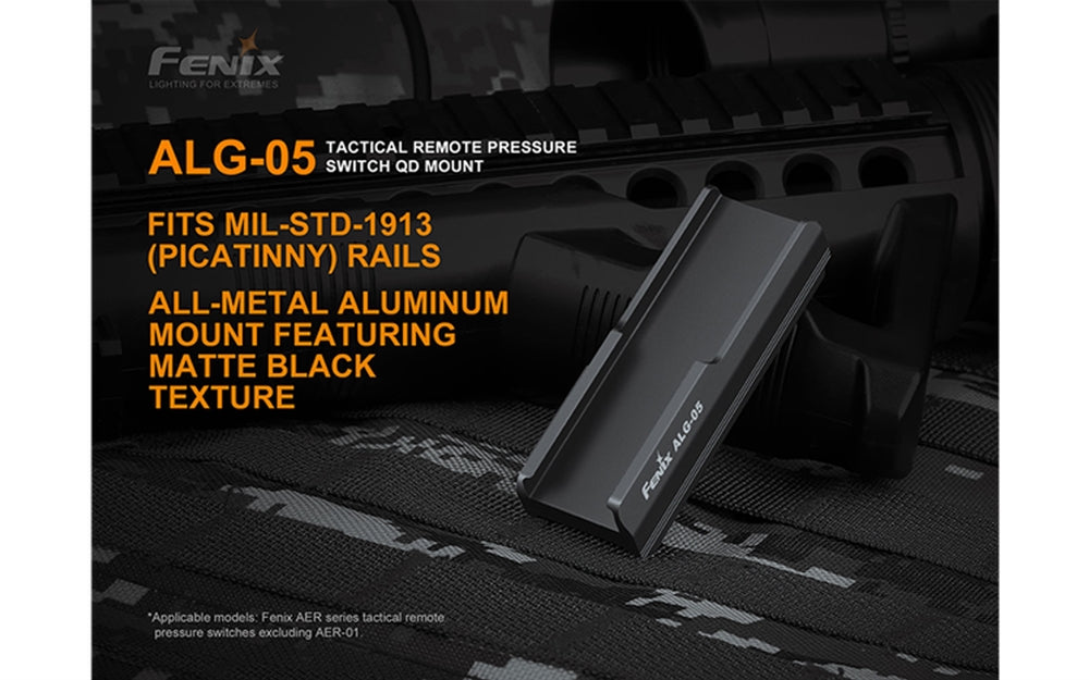 For a better grip of the AER Series pressure switches, pick up the new ALG-05. This Picatinny rail mount is compatible only with the AER-02 V2 and AER-03 V2 tactical remote pressure switches. The body of the ALG-05 Picatinny Rail Mount is made from Aluminum Alloy with a hard-anodized finish and is not reflective for exceptional tactical concealment.