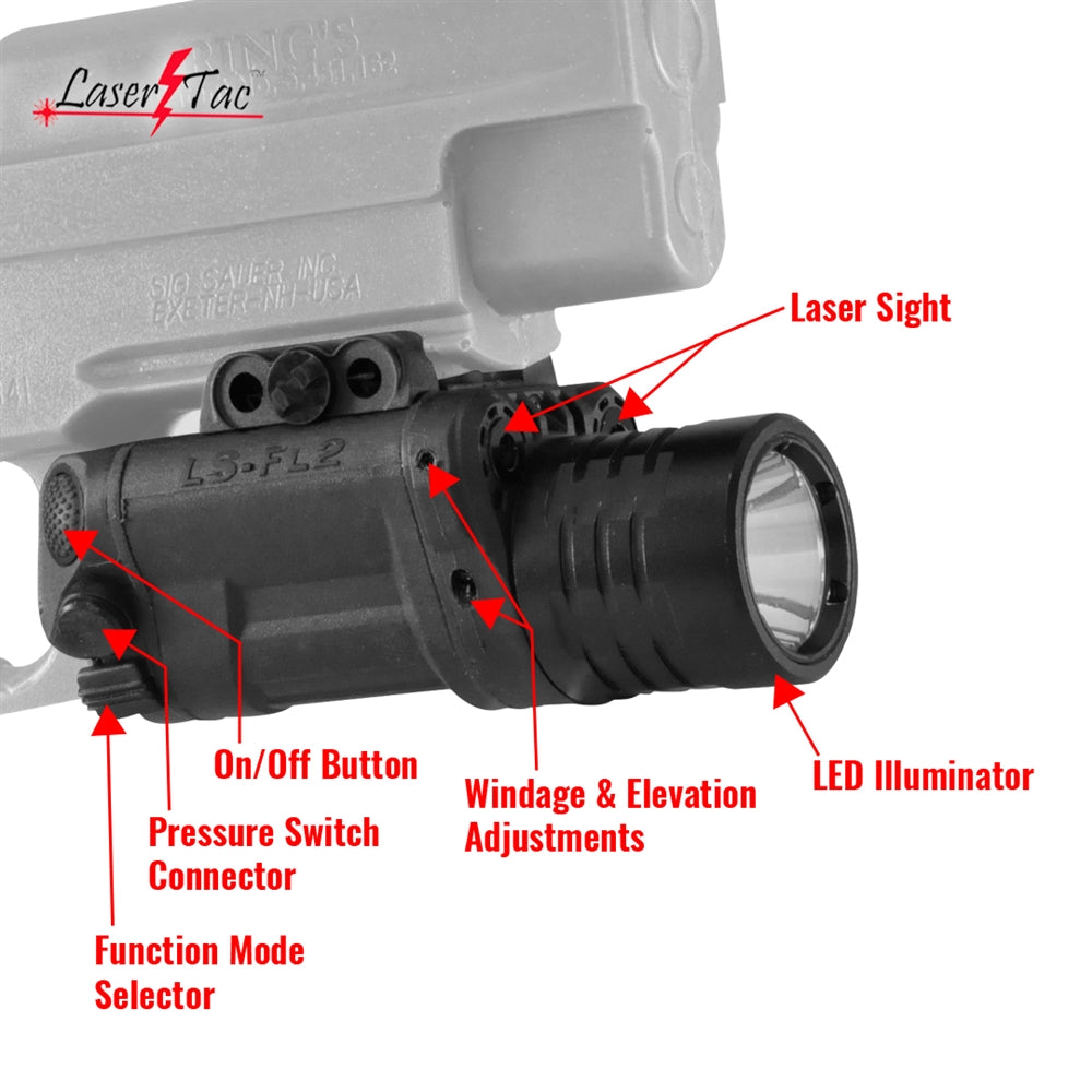 The Lasertac FL2GR is a 3-in-1 combo laser & flashlight designed for pistols or rifles with a rail mount. The FL2GR features a 532nm green laser, a 650nm red laser and an LED flashlight capable of up to 100 lumens output. To suit a variety of tactical situations, choose from six modes including: red laser, green laser, white LED flashlight, white LED strobe, green laser + white LED, and red laser + white LED.This ambidextrous laser has conveniently located on/off push buttons on both sides of the unit. It also features a fully adjustable laser that allows you to alter for windage and elevation. Operating on a single CR123A or RCR123A battery. The robust fiber reinforced nylon construction of the FL2GR makes it waterproof, shock proof, anti recoil resistant and dust proof. See our fitting guide below.