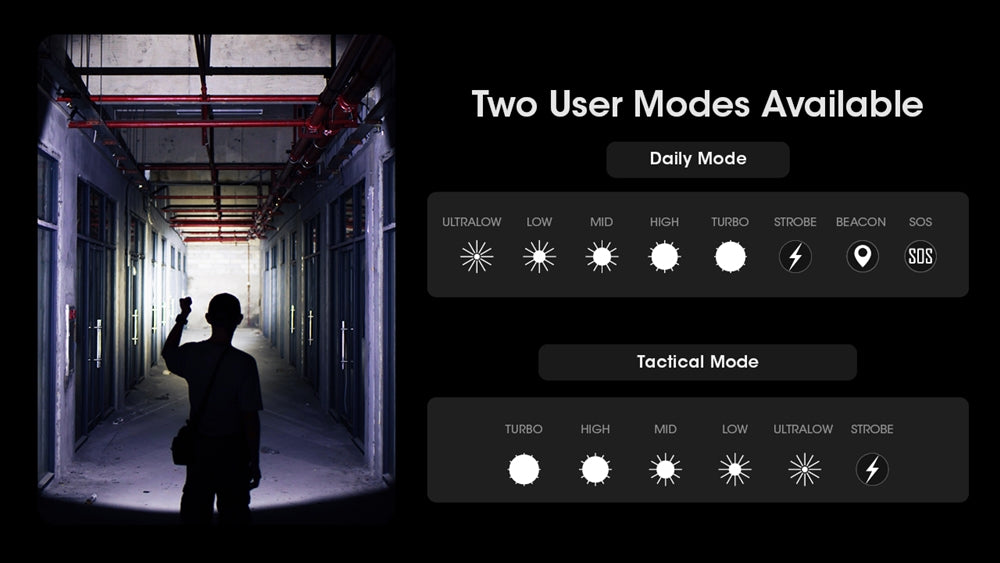 This flashlight offers remarkable versatility with its two modes, Daily mode and Tactical Mode. In Daily mode, users have access to five brightness levels as well as Strobe, Beacon, and SOS, while Tactical mode provides access to all brightness levels and Strobe, all conveniently indicated by the level indicators adjacent to the mode button. Moreover, the MH25 Pro incorporates an intelligent feature that automatically reduces brightness when it detects nearby obstructions, preventing overheating and blinding reflections.