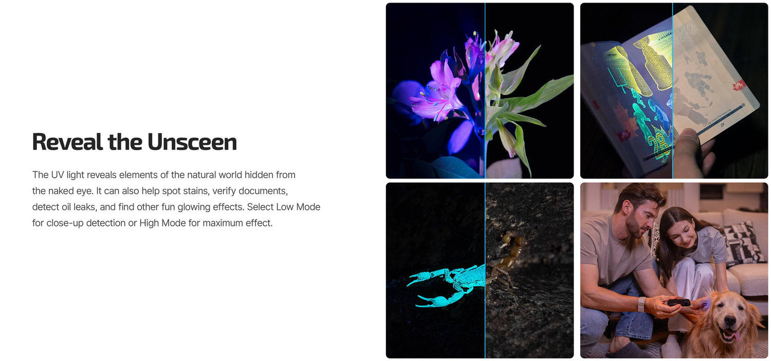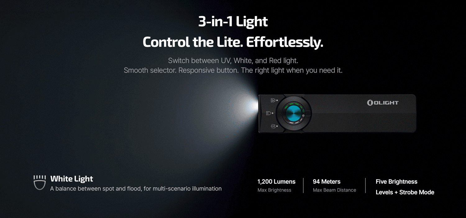 An upgrade from the popular Olight Arkfeld, the Olight ArkPro Lite is a powerful and versatile EDC flashlight that delivers up to 1,200 lumens with a beam distance of 102 yards. The ArkPro Lite offers five distinct brightness modes, a UV light, multiple red-light modes, and a strobe function for emergencies. The UV light includes High and Low settings for detecting counterfeit money, identifying minerals, or checking surfaces for cleanliness. The red light mode protects your night vision or serves as a long-lasting signal light with three options: Low, High, and SOS. Switching between light sources is simple with the ArkPro Lite’s circular selector, while a central button conveniently powers the light on and off and adjusts brightness.