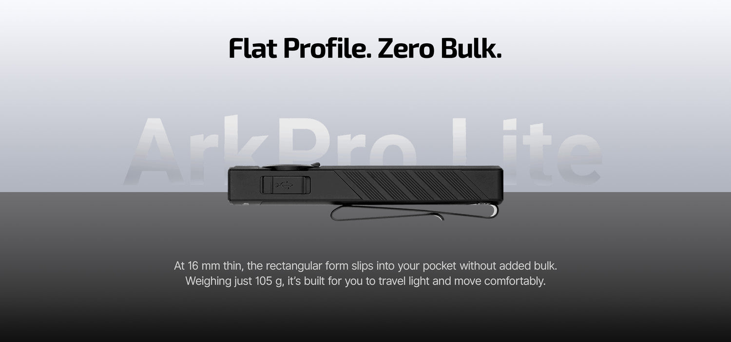Measuring only 4.37 inches in length, the ArkPro Lite has a slim, ultra-thin profile that slips easily into your pocket or attaches securely with the pocket clip to backpacks, belts, and more for convenient access. Crafted from durable aluminum alloy, it withstands drops of up to 1 meter and is water-resistant to the same depth with an IPX7 rating—making it a dependable companion for everyday tasks, outdoor adventures, and more.