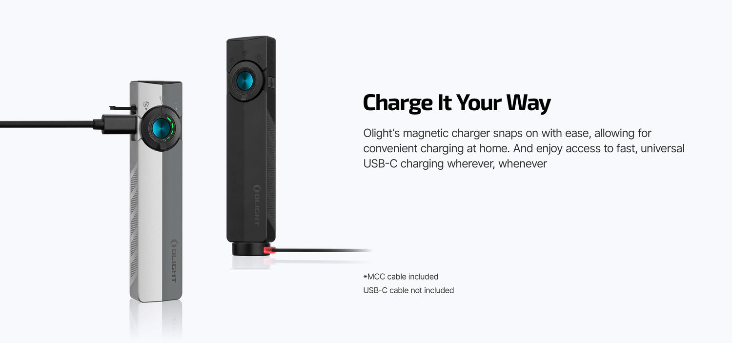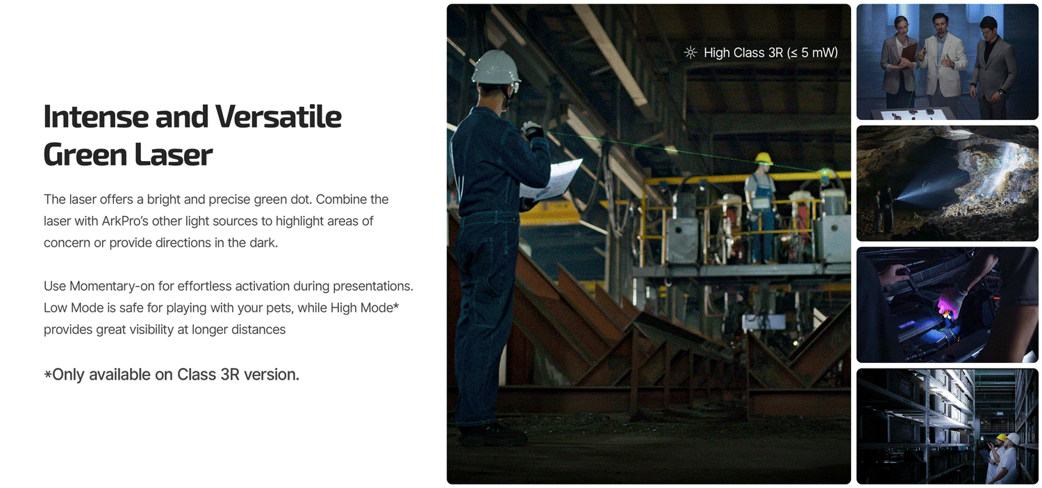 The Olight Arkfeld Pro has long been regarded as the crème de la crème of EDC flashlights, and now Olight has reimagined it with a bold new vision. The new ArkPro introduces both floodlight and spotlight modes, offering brighter illumination, expanded settings, and a refined, sleeker design. It delivers up to 1,500 lumens with a beam distance of 224 yards. The ArkPro offers five brightness levels, each with both Spotlight and Floodlight options. The Spotlight provides pinpoint accuracy for long-range searches, while the Floodlight delivers wide coverage for exploration, caving, and everyday use - giving you the perfect beam for every moment. The ArkPro also features a Strobe mode that can be used for emergencies. Beyond its main beam, the ArkPro is equipped with a UV light and a green laser pointer. The UV light includes High and Low modes for detecting counterfeit money, identifying minerals, and checking surfaces for cleanliness. The green laser, also with High and Low modes, is excellent for surveying, presentations, or long-distance demonstrations. Both can be used at the same time as the flashlight for maximum versatility. Switching between the three light sources is simple with the ArkPro’s circular selector, and a central button conveniently powers the light on and off and adjusts brightness. A separate button on the side of the ArkPro activates the green laser.
