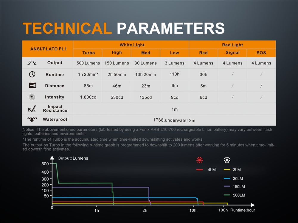 Fitted with a CREE XP-G3 LED the Fenix LD15R reaches up to 500 lumens output across four brightness outputs. A total throw distance of 92 yards gives appropriate lighting for the majority of everyday tasks. A secondary red LED allows for an additional three outputs - constant, SOS and Signal - for preserving night vision and emergency signaling. Whatever the task, the LD15R is sure to have the output you need! A simple, single-button located on the top of the light controls on/off and access to all outputs.Easy Powering with Built-in USB Charging