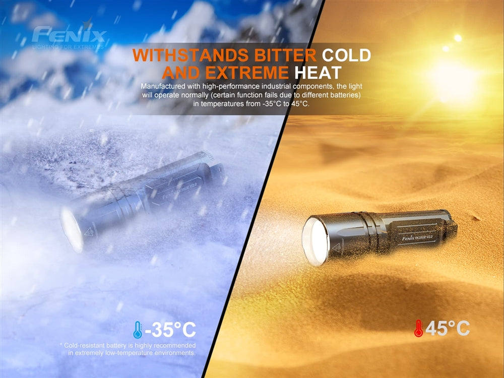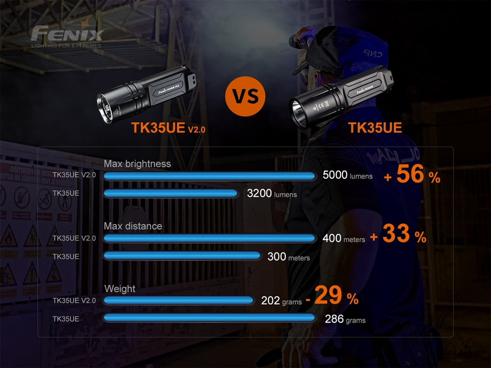 The Fenix TK35UE v2.0 returns as the third refinement of the popular TK35.as Upgraded with a 3x high performance Luminus SST40 LEDs, the TK35UE v2.0 now has a super bright 5000 lumen output delivering up to 437 yards throw. The TK35UE v2.0 is made of tough A6061-T6 aluminum and coated with a HA III finish for superior impact resistance and durability. The TK35UE v2.0 is a great high lumen flashlight suitable for a variety of tasks from night operation to searching, caving and more.