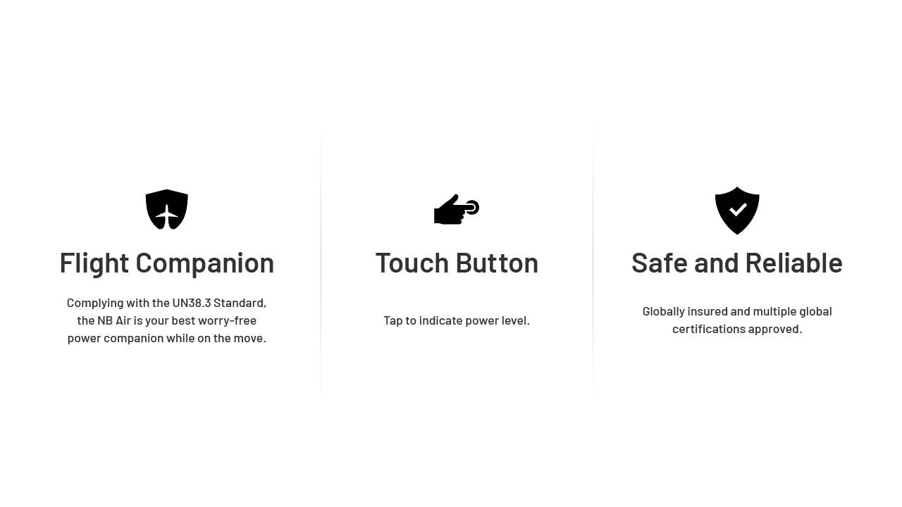 The NB Air features a USB-C port for fast and convenient charging, making it compatible with a wide range of devices. Checking the remaining power is simple—just press the Power Button to illuminate the four blue LED indicators for a quick status update. Built for durability, its seamless design boasts an IPX7 waterproof rating, protecting it from rain, splashes, and humid environments. Additionally, the NB Air is airline-approved, making it the perfect travel companion whether you're flying, commuting, or heading off the grid. With its combination of lightweight portability, rugged durability, and reliable performance, the NB Air is ready to power your adventures anywhere.