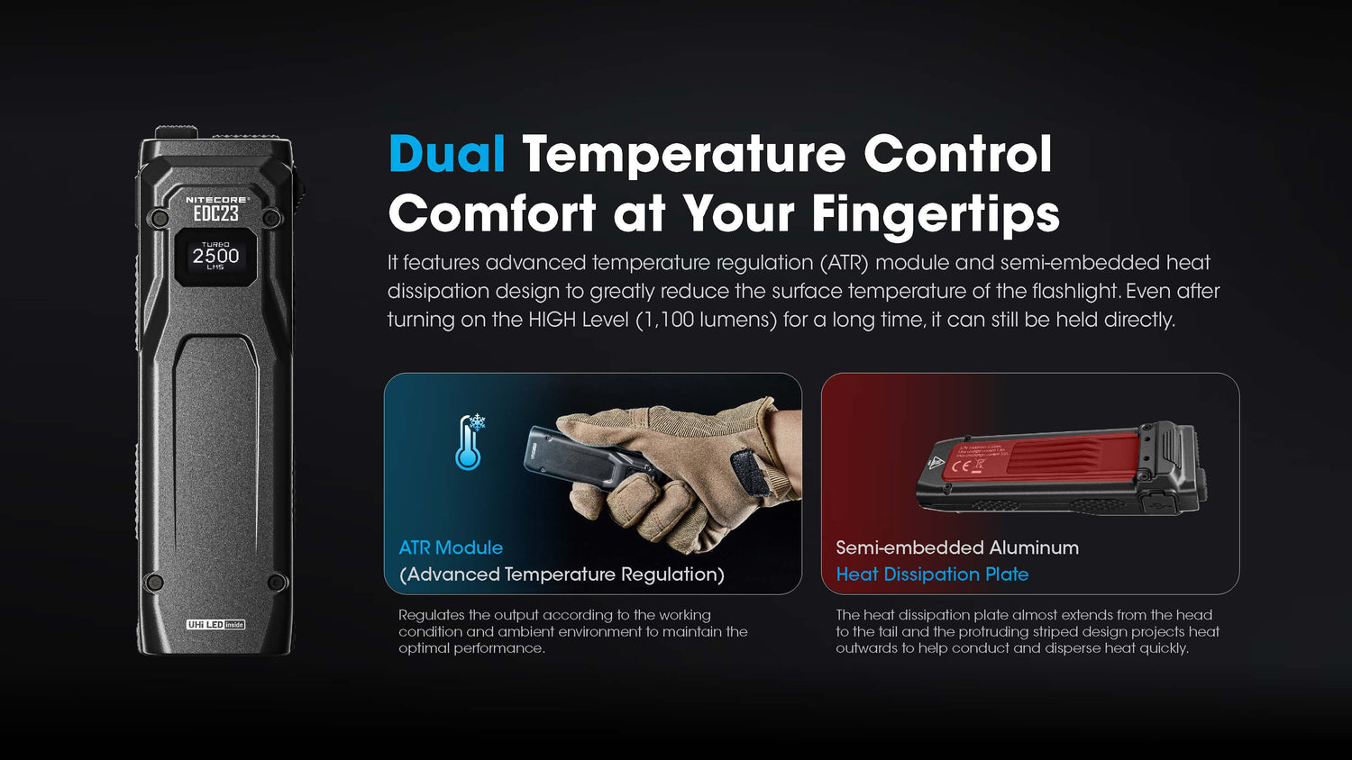 Designed for versatility, it provides five brightness levels and a Strobe mode. If the light turns off, the EDC23 features memorization and will return to the previously used mode. Its digital OLED screen displays the brightness level, remaining battery power, and more. For quick access, half-press and hold the mode button for Turbo, or fully press and hold it for Strobe. This makes EDC23 an excellent tactical flashlight as well. To prevent overheating, the EDC23 automatically reduces brightness if accidentally activated in High mode. This feature activates only when the light is turned on unintentionally and deactivates during regular use. Additionally, the EDC23 features an easy-to-use sliding lock switch to prevent accidental activation. It comes with two lockout modes: Semi and Full. In Semi Lockout, you can Turbo and Strobe, while Full Lockout will disable all functions.