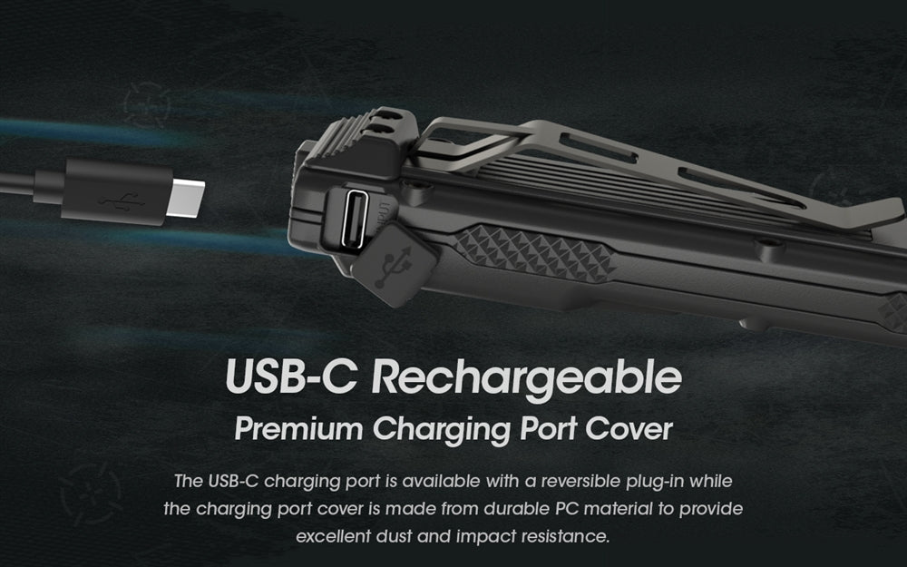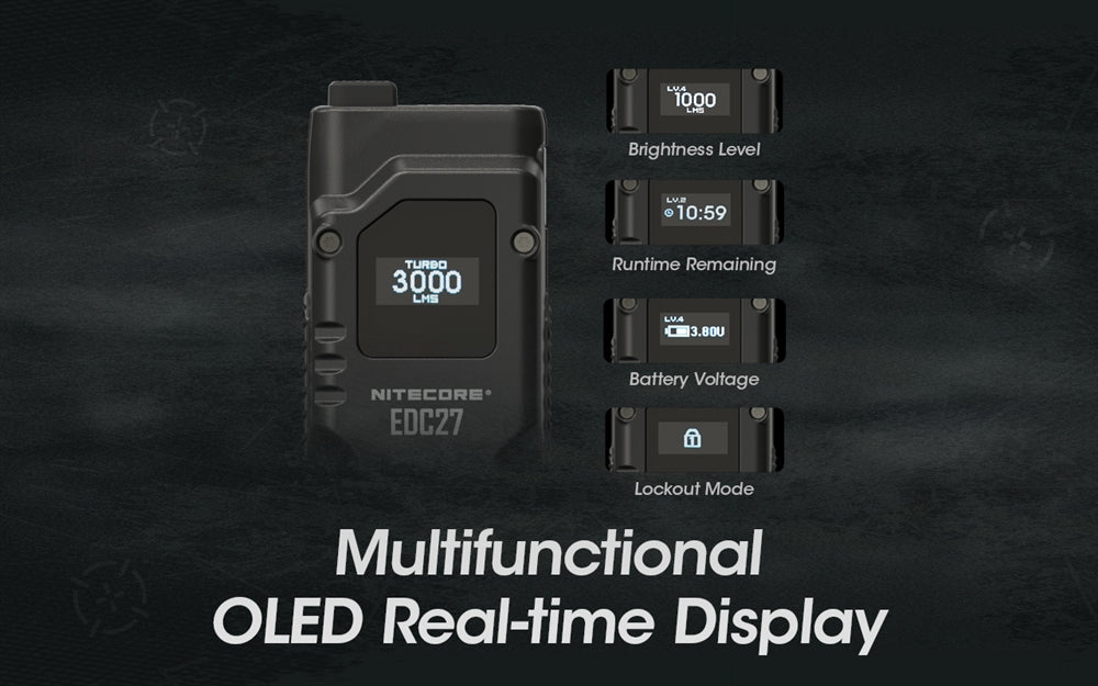 The Nitecore EDC27 is equipped with a built-in battery for up to a 37 hour max runtime. On the side is a protected USB-C fast charging port for rapid charging to full in just an hour and fifteen minutes. The beloved OLED digital display screen gives the EDC27 a modern stylistic touch. The screen provides real-time data on brightness level, remaining runtime, and battery information for users.