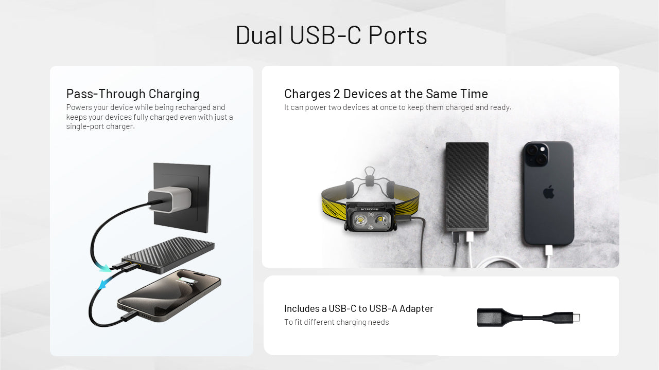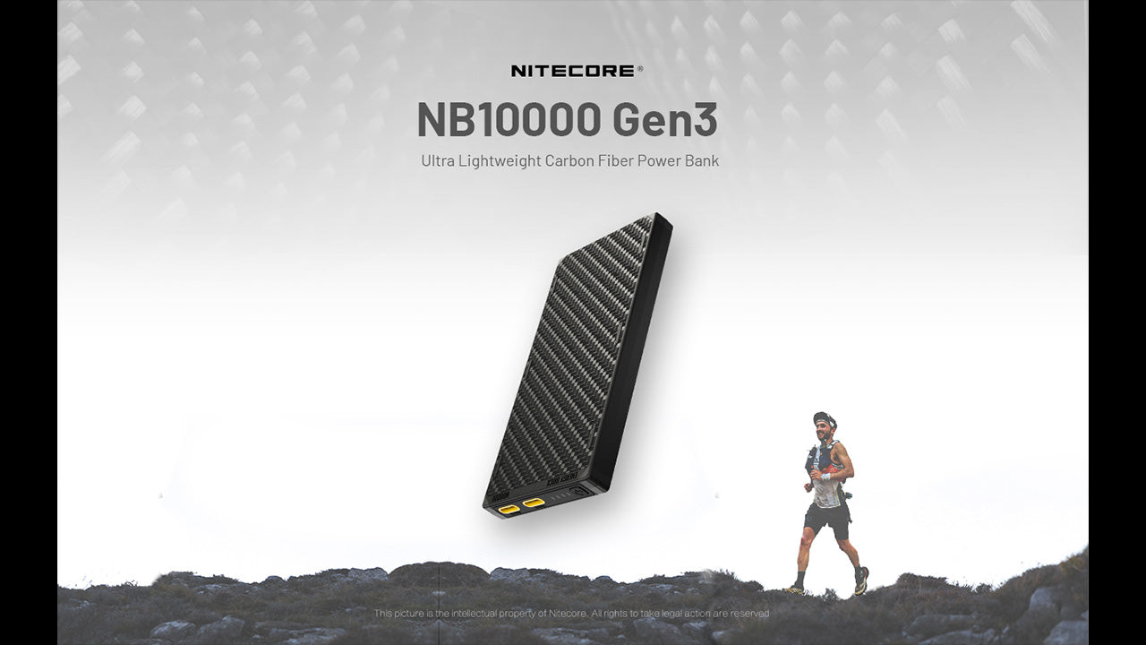 The Nitecore NB10000 Gen 3 Power Bank is a lightweight, portable power bank with a capacity of 10,000mAh, designed to meet all your charging needs no matter where you are. Compared to its predecessor, the NB10000 Gen 3 now features two USB-C ports for convenient charging. Encased in a solid carbon fiber frame, the NB10000 Gen 3 is 40% lighter than conventional power banks while being smaller and thinner than a phone, with a sleek, modern, minimalist design. This makes it the ultimate portable backup battery charger for road trips and outdoor enthusiasts who enjoy trail running, hiking, camping, and more. It is also a great addition to your emergency prep kit or bug-out bag.