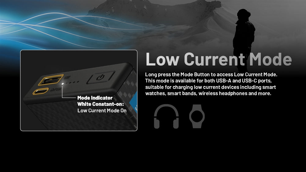 Equipped with dual ports, the Summit 20000 features a QC PD USB-C port capable of fast-charging the power bank itself or other devices at 18W and 20W respectively. It also comes with a USB-A QC output port, allowing for the charging of other electronic devices.When the quick charge is not desired for delicate devices such as bluetooth headphones or smart watches, the Summit 20000 has a one-touch low current mode.