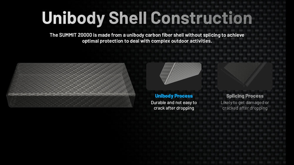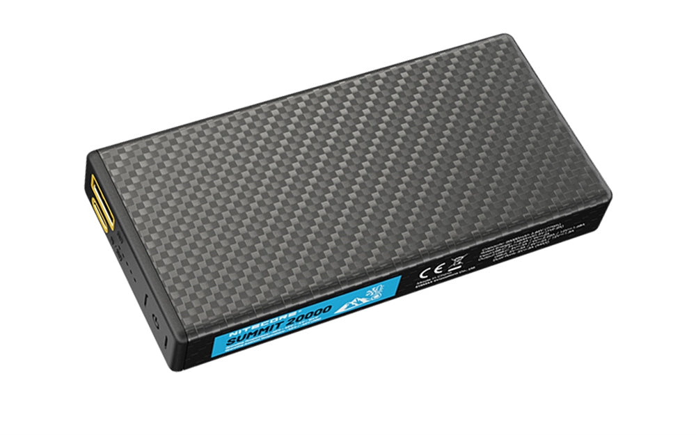 The Nitecore Summit 20000 power bank is crafted with a unibody carbon fiber shell, making it both sturdy and exceptionally lightweight, tipping the scales at just 10.69 ounces. Its seamless design not only renders it impact-resistant up to 1.5 meters, but it's also rated IPx5 water-resistant, perfect for outdoor adventures.
