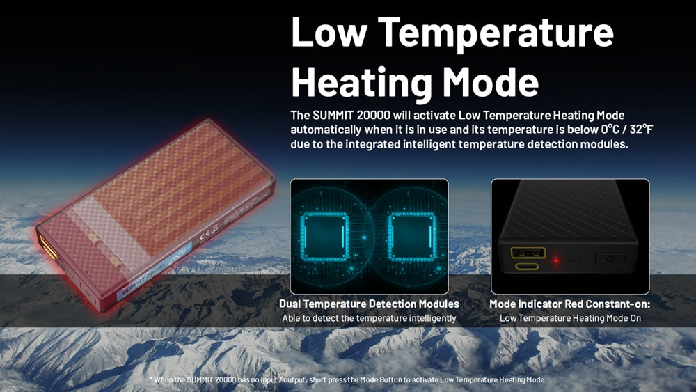 The Nitecore Summit 20000 power bank offers a high-capacity energy of 20000mAh, paired with an impressive low temperature resistance of -40°C/F. Unlike other power banks that lose efficiency in cold temperatures, the Summit 20000 can still charge a modern Phone up to 4.6 times even on top of Mount Everest. When temperatures drop below freezing, the Summit 20000's intelligent heating function activates, consuming ultra-low power to maintain optimal temperature and prevent power loss or inefficiency. The Summit 20000 also includes an insulated carrying bag and a reliable braided USB-C to C cable for seamless power transfer. If you're aiming for the top, make sure you bring along the Nitecore Summit 20000 power bank.