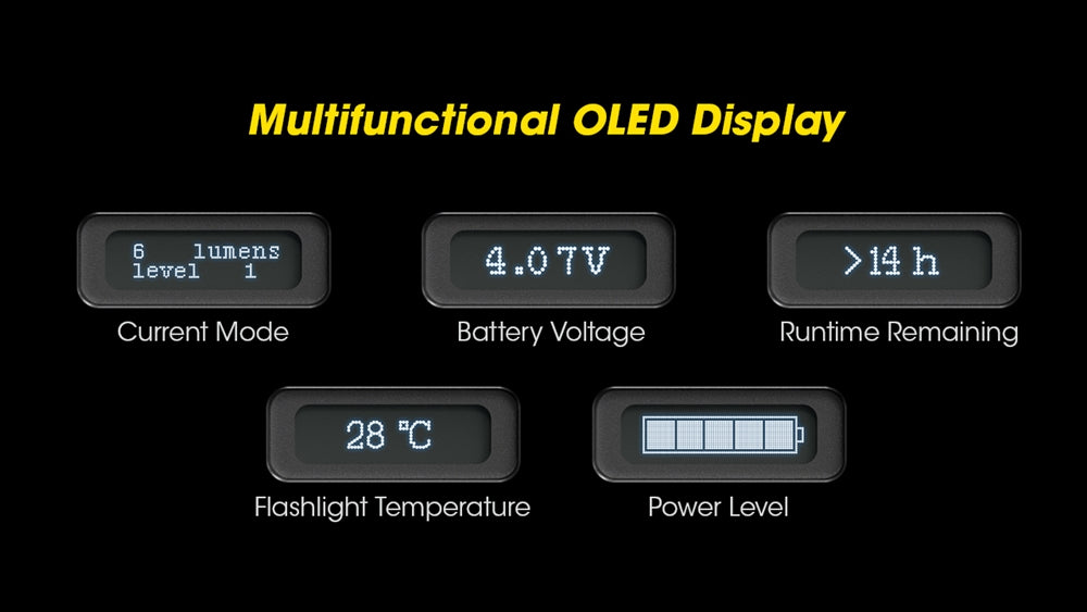 The Nitecore TM12K is USB-C rechargeable. It can be fully charged in only 1.5 hours thanks to the quick charge (QC 2.0) technology. With a brightly lit OLED screen, you'll always know key operating information such as brightness output, battery level, remaining runtime and temperature.