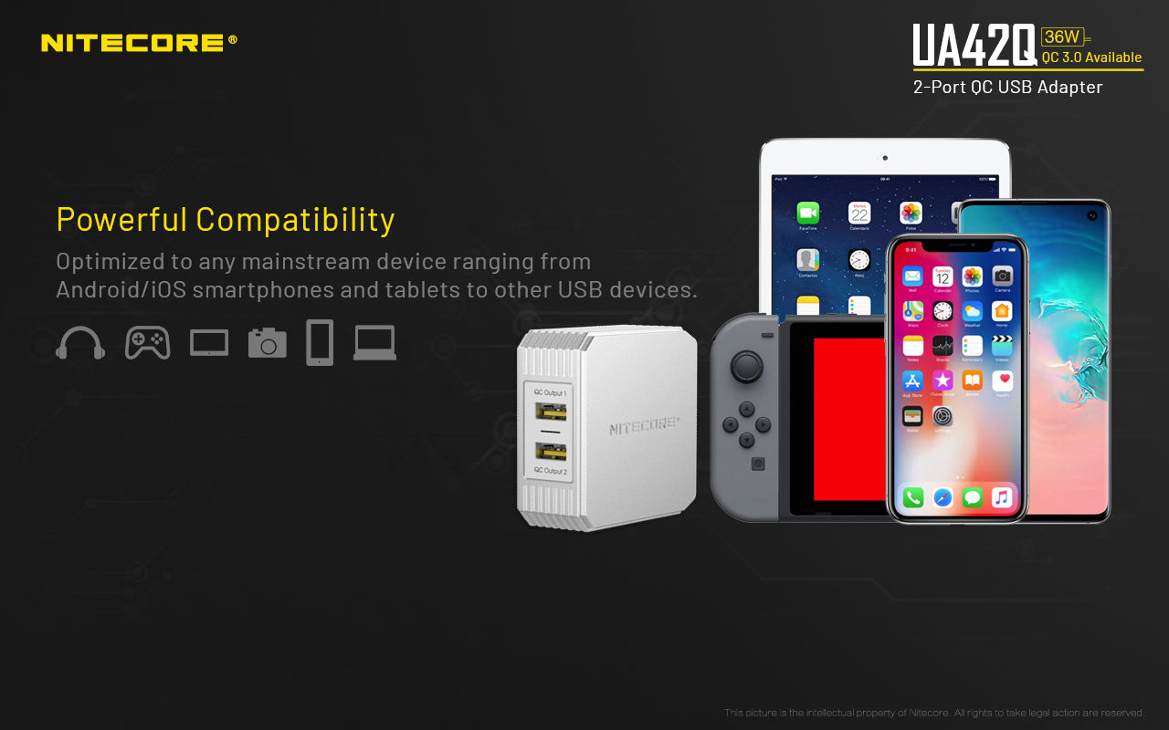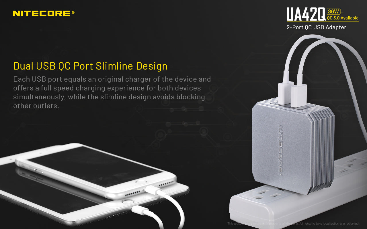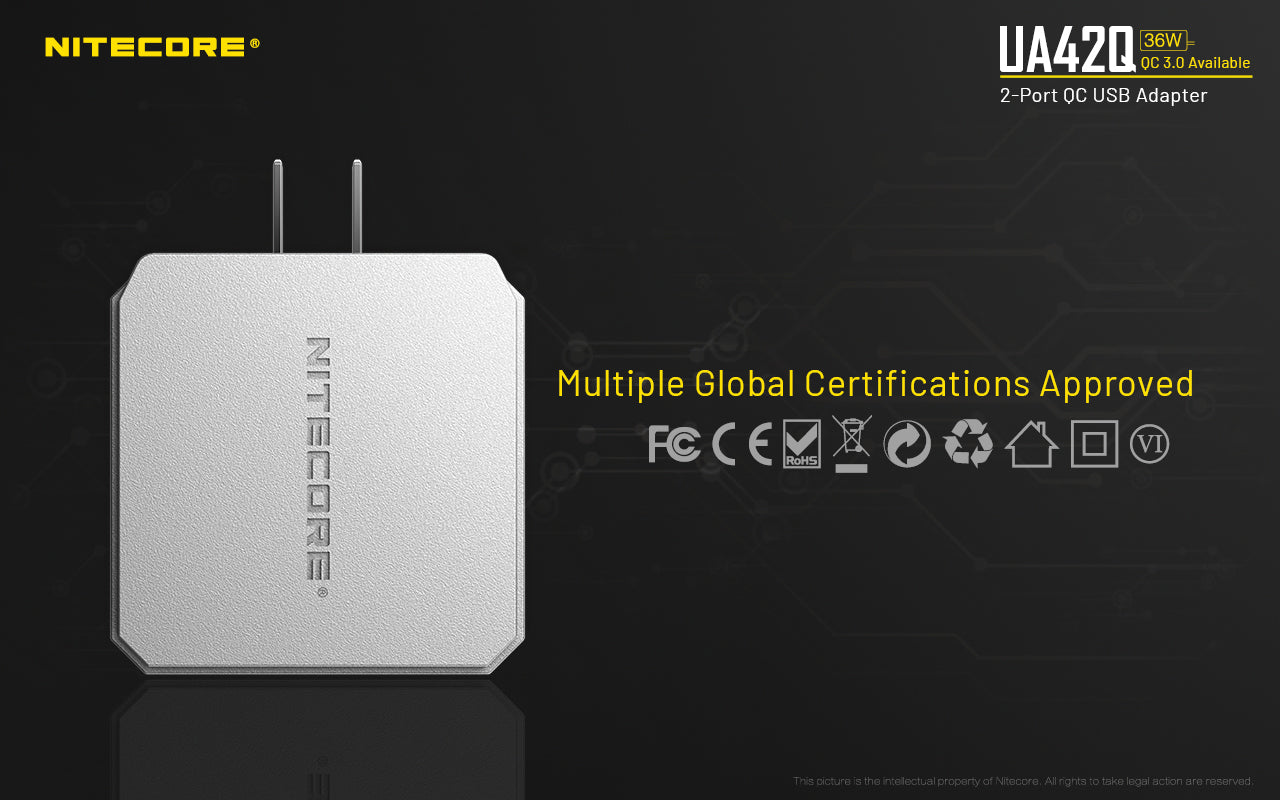 The NITECORE UA42Q provides two QC 2.0 & 3.0 ready charging ports for your Samsung, Android, and other QC enabled devices including NITECORE fast chargers like UMS2 UMS4 and more. Simultaneously pushing out up to 3A of current from each port, it outperforms a traditional USB adapter by over 300%. Furthermore, UA42Q is compatible with all mainstream devices as a standard USB power adapter.