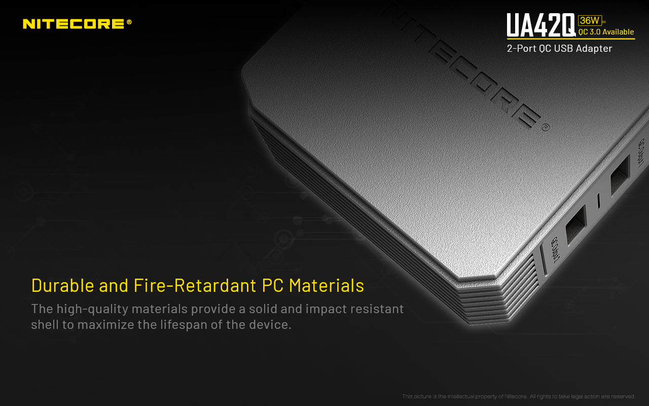 NITECORE UA42Q is packed with safeguards such as built-in surge protection as well as overcharge protection, anti-static protection, and automatic shut-off. All of this is packed in a compact form factor made from durable fire-retardant material with anti-scratch and impact resistant properties.