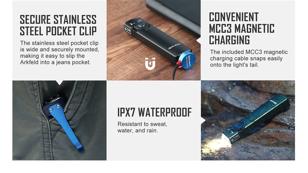 The Olight Arkfeld is equipped with a built-in 1050mAh battery for extended runtimes and fast charging for busy users. On the bottom of the Arkfeld is Olight's proprietary magnetic charging ring for fast snap-on charging with the included MCC3 USB charging cable. Below the switch is a battery level indicator for rapid battery health readouts.