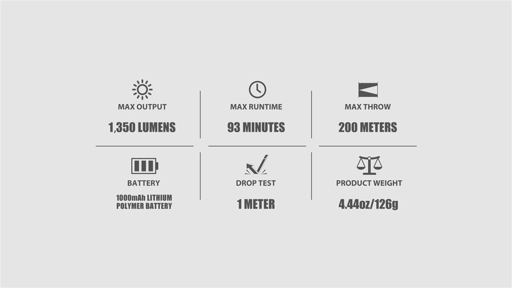 High | 1350 ⥊ 500 ⥊ 300 lumens | 1.5 min ⥊ 38 min ⥊ 10 min |